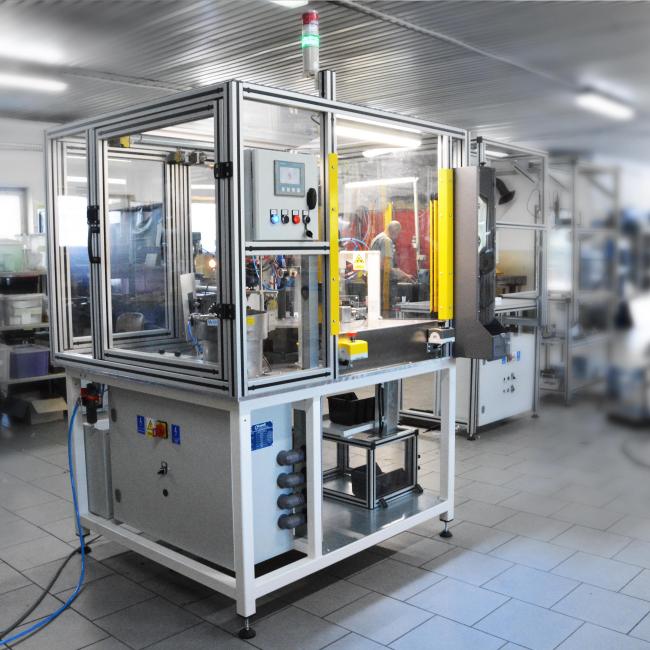 Автоматическая машина с ручной загрузкой. Предназначена для автоматической сборки муфт. В состав машины входят поворотный столик, вибрационное устройство для подачи уплотнителей типа o-ring и система контроля на базе машинного зрения.