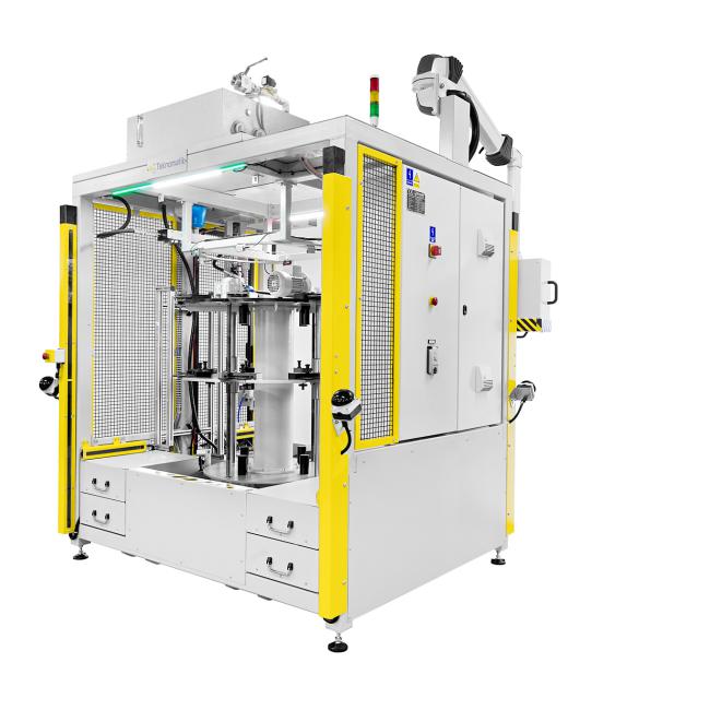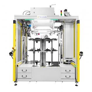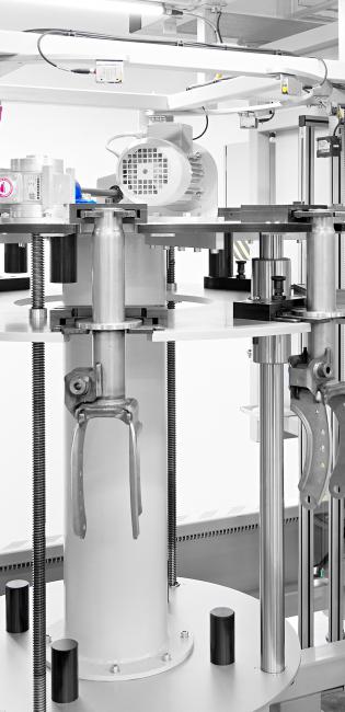 Sercem maszyny jest stół obrotowy, zbudowany na bazie wysokiej jakości serwonapędu Fibro o dokładności pozycjonowania +/- 30". Ze względu na różne długości amortyzatorów, możliwe jest dostosowanie wysokości środkowej płyty. Ruch góra-dół realizowany jest za pomocą siłownika elektrycznego. Pozycja zadawana jest z panelu operatorskiego oraz może być zapisana dla każdej referencji. Na górnej płycie stołu zamontowano specjalne chwytaki sprężynowe trzymające amortyzatory.