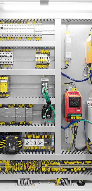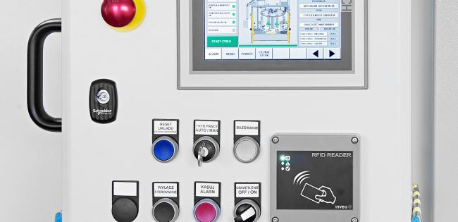 Elementy sterowania oraz wyświetlacz umożliwia wybór odpowiedniej referencji, podgląd stanu procesu oraz sterowanie poszczególnymi napędami maszyny. Panel operatorski zamontowany jest na ramieniu RITTAL, dzięki czemu można go swobodnie przemieszczać we wszystkich kierunkach.