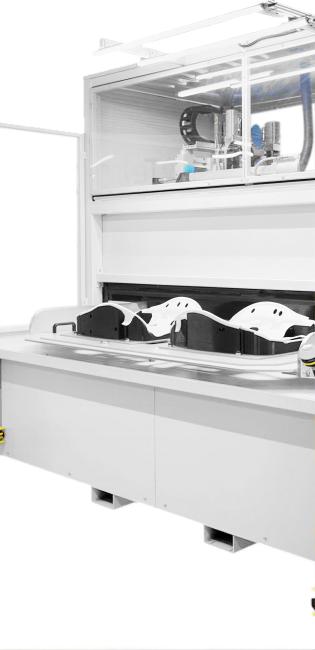 Operator umieszcza materiał na dwupozycyjnym stole obrotowym. Po obrocie stołu detal trafia do szczelnej komory, gdzie dwie głowice laserowe wycinają zaprogramowane kształty. W tym samym czasie system odciągu skutecznie odprowadza opary powstające podczas obróbki. Gotowy element opuszcza strefę roboczą przy kolejnym cyklu stołu, który jednocześnie wprowadza nowy arkusz materiału.