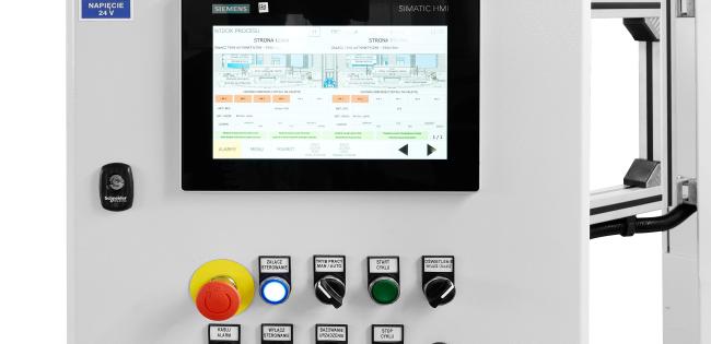 Cykl rozpoczyna się od załadowania elementu przez operatora na gniazdo paletki w wysuniętej szufladzie. Po ustaleniu detalu operator inicjuje pracę przyciskiem „Start”. System, poprzez panel HMI, weryfikuje stan czujników pozycjonujących; w przypadku błędu, operator otrzymuje precyzyjną informację, który punkt wymaga korekty. Start procesu jest możliwy wyłącznie przy aktywnej blokadzie stołu obrotowego.