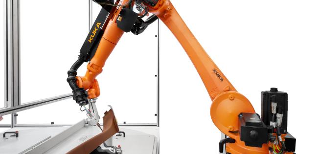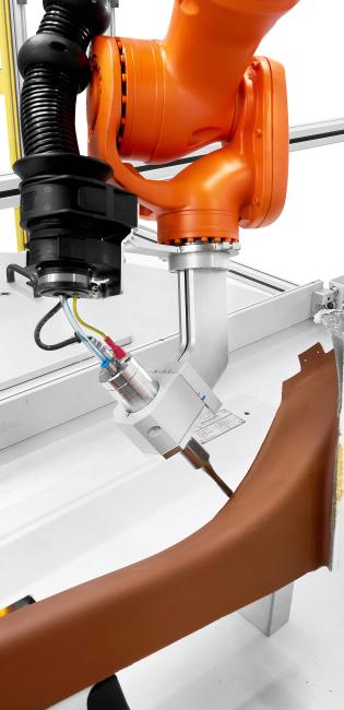 - Obróbka: Robot KUKA KR 8 R2010-2, wyposażony w nóż ultradźwiękowy na przystawce kątowej, precyzyjnie dociera do wszystkich krawędzi detalu.